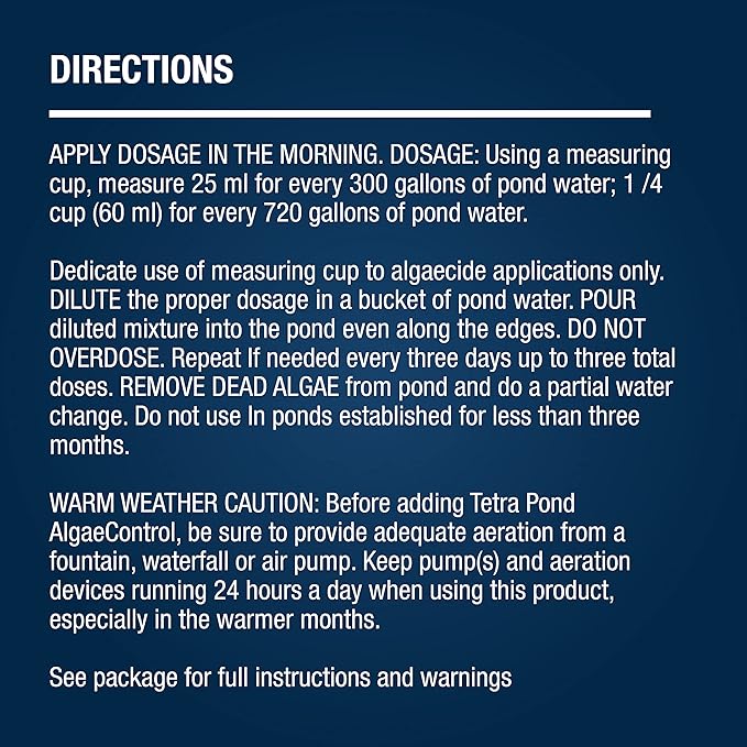 - USAGE: Use 25 mL for every 300 gallons of pond water.