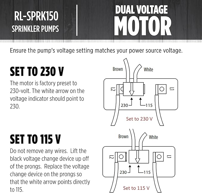 - DUAL VOLTAGE MOTOR: select 115 Volts or 230 Volts to match incoming power source; factory set to 230 Volts but easy to switch to 115 Volts (see manual)