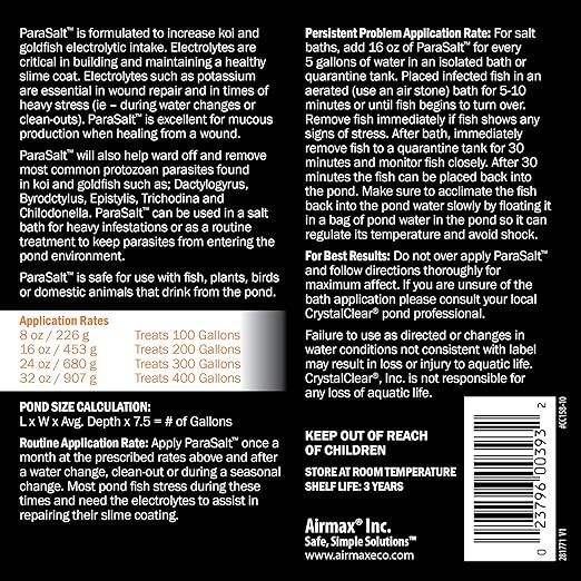 - Improves Poor Parasite Conditions - ParaSalt will help ward off the most common protozoan parasites found in ponds. Helps prevent common diseases while supporting fish health.