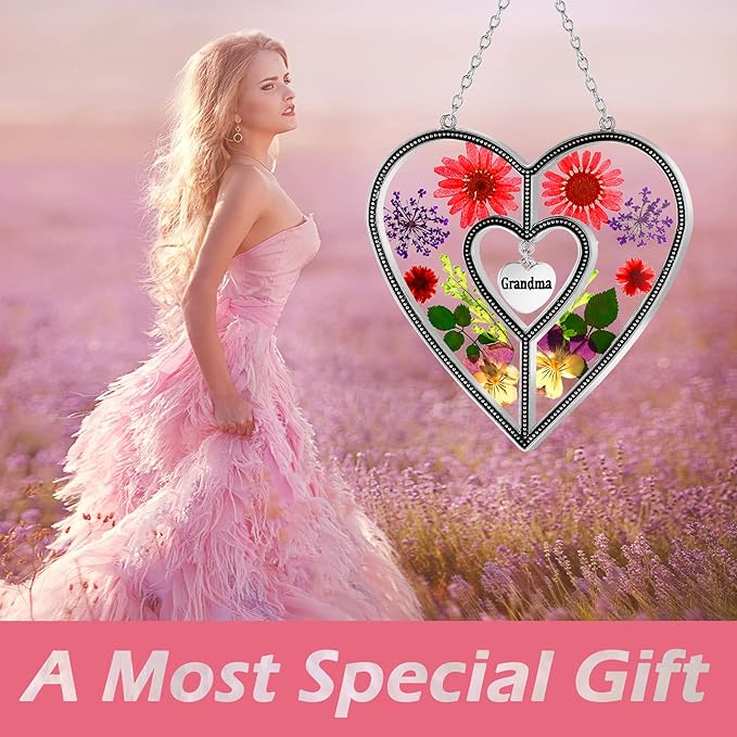 - [Attractive and unique Heart design] - This new Heart style features a stained-glass style with decorative metal edges and real flowers pressed between the glass. Adorned with Grandma Heart, and outstanding engrave craftsmanship. Rose gift boxes packing, comes with a suction cup and you can hook it quickly and easy to hang.