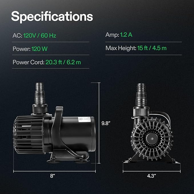- Energy Saving with Low Noise: Ultra-quiet operation design (30-40 dB); Less power consumption (120W) with higher output (2700GPH/10000LPH) as compared to other pumps; It’s fit for 420-gallon pond
