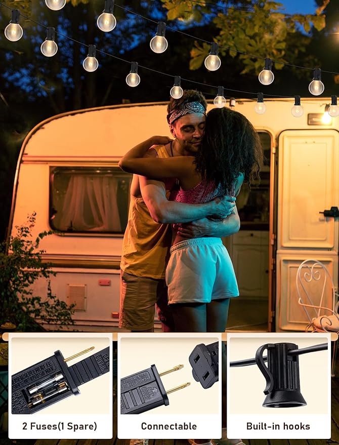 • 100 feet string lights with 102 G40 Edison clear bulbs (2 Spare Bulb), candelabra(E12) socket base,5Watt Bulbs,500W per string, 120 power.The male plug contains a spare fuse for safety-UL listed