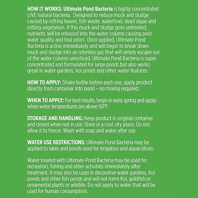 - For Lakes, Ponds and Water Gardens: Highly concentrated bacteria is formulated for large ponds but also works great in backyard water gardens, koi ponds, fishponds, and water features or fountains.