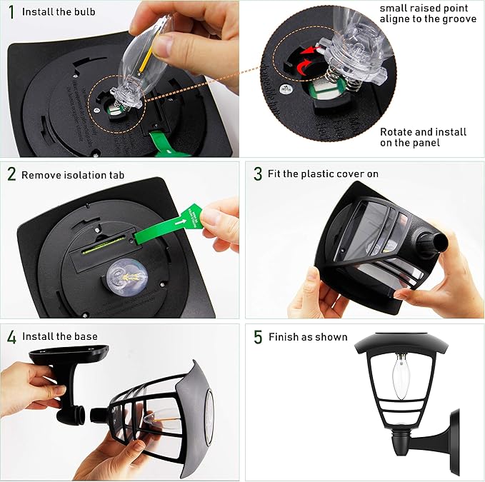 - Outdoor solar powered lights--powered by solar, charged in full and direct sunlight for 6-8 hours, the lights automatically turn the lights on at dusk and off at dawn. There is an INSULATION TRIP on the light cover, before charging need to unscrew the light cover then REMOVE INSULATION TRIP.