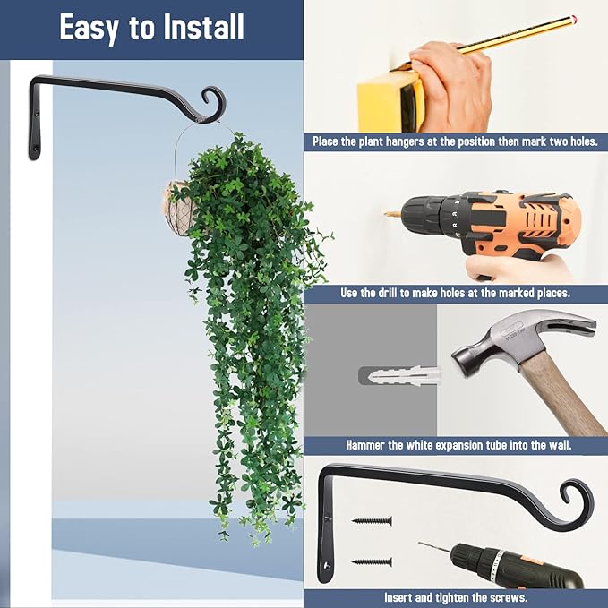 - 【HIGH QUALITY】The plant hook is 4.5 inches in height and 10 inches from the wall, screw length is 1.6 inches, the screws are included. These hanging plant hooks are made of high-quality iron and coated with powder,they are rust and corrosion resistant. Premium quality makes them sturdy.