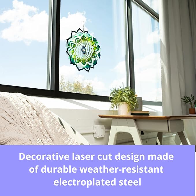 - Durable and Mesmerizing: Crafted from weather-resistant electroplated steel metal with an intricate laser-cut design, this wind spinner showcases mesmerizing patterns that captivate onlookers.