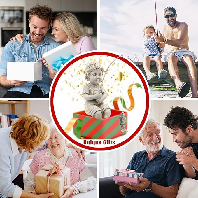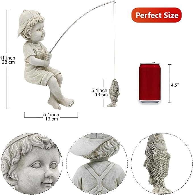 - Unique Design - Our Fisherboy has caught a wee little fish.Ready to pose on your pond edge. You will enjoy many laughs with friends, and family with his catch of the day on his fishing lure.