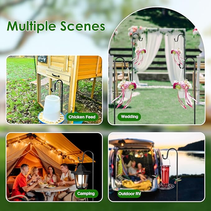 - Effortless Setup and Installation: Setting up your Shepherd's Hooks is a breeze. Simply stake them into the ground, and they are ready to hold your favorite garden decorations, bird feeders, or lighting fixtures, allowing you to transform your space in minutes.