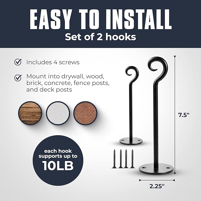 - Easy to install: Simplified setup with 4 screws for mounting onto drywall, wood, brick, concrete, fence posts, and deck posts. Each of the 2 hooks, measuring 7.5" in length, 2.25" in width, and 2.25" in height, accommodates up to 10 lbs. Sold as a set of 2 hooks. Enhance organization with this set of hooks for versatile storage solutions.