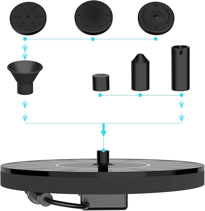 - ✔【6 Spray Nozzles】:You can form 6 different nozzles by combining kits,The 6 different fountain heads all provided pleasing patterns with the little water jets. Choose any one spray water pattern you like. The water can rise up to 50-70cm approx.
