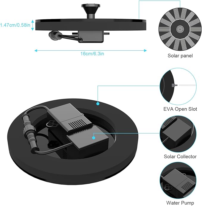 - ✔【Easy to Use】: No need to install the pump Just put in the water, the pump will start to work in 3s once exposed to sufficient sunlight, Perfect for bird bath, fish tank, small pond, pool, garden, water circulation for oxygen.