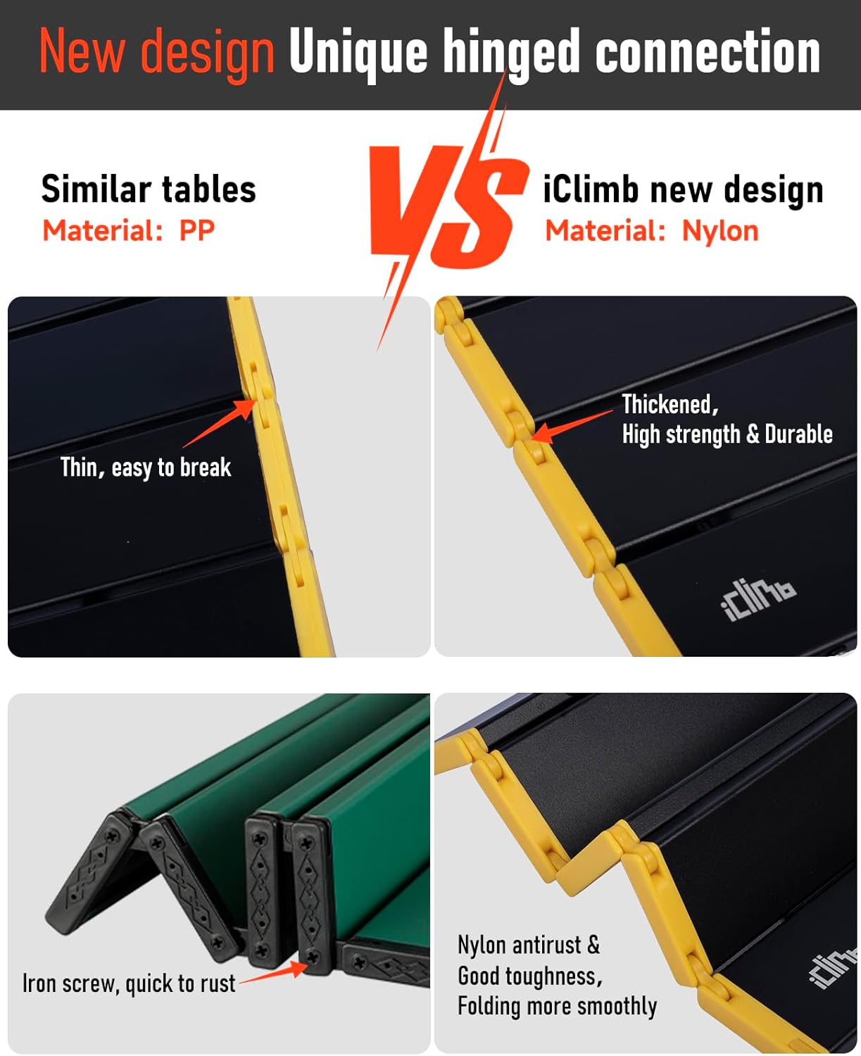 - Unlike other similar tables with bungee cord connection, this table has unique hinged design connection which will make it last many years.