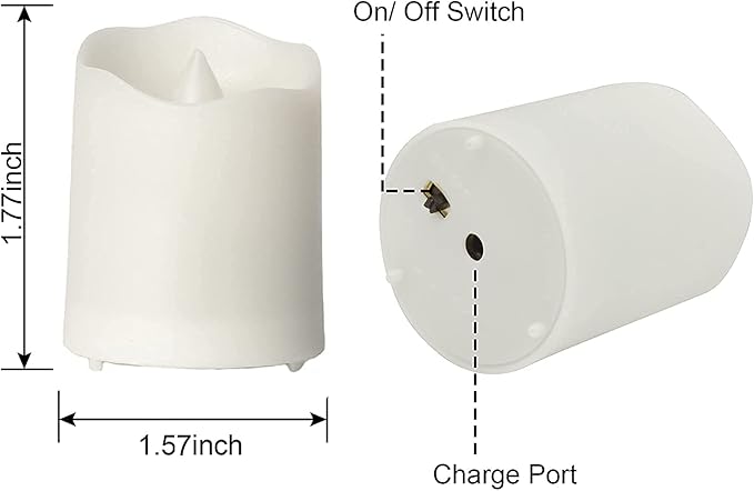 - Size and Package: Height 4.5cm/1.77inch, Diameter 4cm/1.57inch. 12 rechargeable tea candles, 2 usb charging cable, 1 user manual.