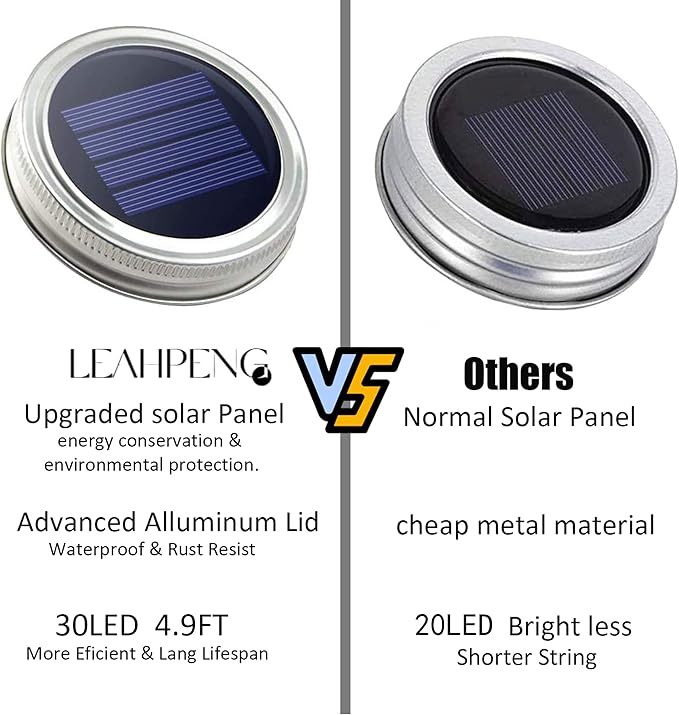 - ✨Mason Jar Lights - SmilingTown’s New Upgraded 10 Pack 30 LED solar mason jar Lids string Lights ,lights up more effective and Fits for most regular mouth mason jar,Decoration for weeding, patio,garden, party,photograph. (10 Hangers Included but Jar Not Included)