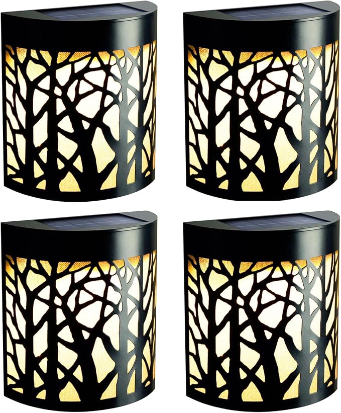 DenicMic Solar Wall Lights Outdoor Wall Sconce Fence Lighting for Patio Front Door Yard Deck Stair Led Forest Decorative Lamps, Waterproof, Warm White/Color Changing (4 Pack)