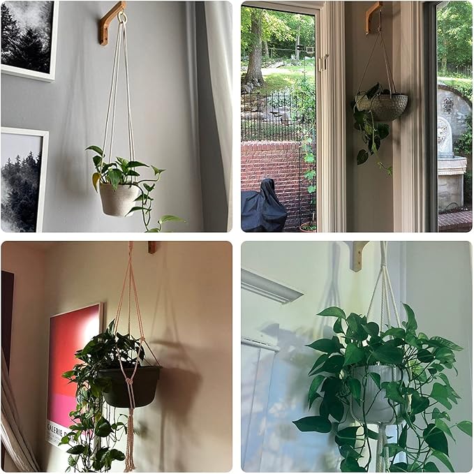 - 🌿Premium Quality: The plant bracket hooks are made of an improved version of high-solid wood, which is light in weight while maintaining the firmness and durability of the wooden hook. It can hold an 11" diameter planter without touching the wall and They come with adequate screws for wall studs and universal anchors for other types of walls that can hold a maximum of 15 lbs.