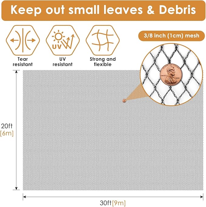 - ๐ฅ๐ฒ๐น๐ถ๐ฎ๐ฏ๐น๐ฒ ๐๐ถ๐๐ต ๐ฃ๐ผ๐ป๐ฑ ๐ฃ๐ฟ๐ผ๐๐ฒ๐ฐ๐๐ถ๐ผ๐ป - 3/8 inch SMALL mesh size leaves pond netting can be effective prevents the leaves,branches and debris from falling into the ponds and keep the water be clear and healthy. Also protect your goldfish and koi fishes against birds, cats, and other predators.