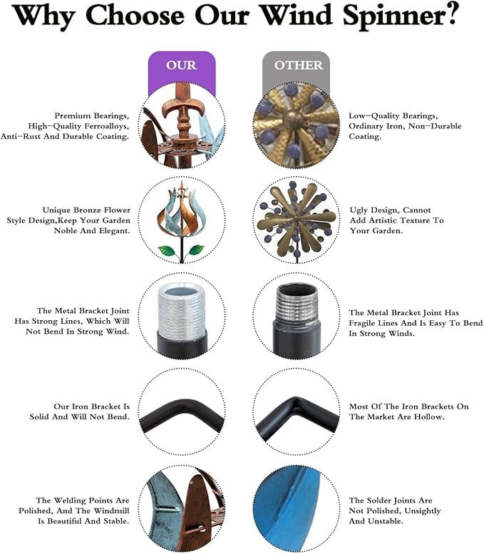 - Edge Blunting: Protect your hands when installing and using kinetic wind spinner, not easy to get hurt. Provide easy-understand installation instructions, you can finish assembling in minutes