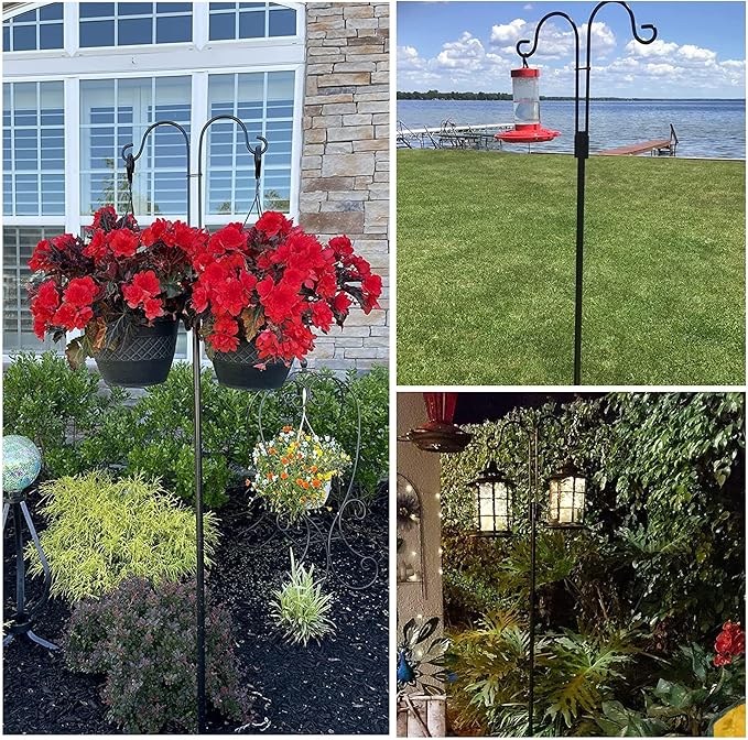 - Versatile And Multi Purpose: Thanks to the sturdy build coupled with the double arm design, our shepherds hook for outside provide the perfect fit for hanging solar lanterns, flower baskets, plant pots, hummingbird feeders, wind chimes, and more to complement any outdoor space