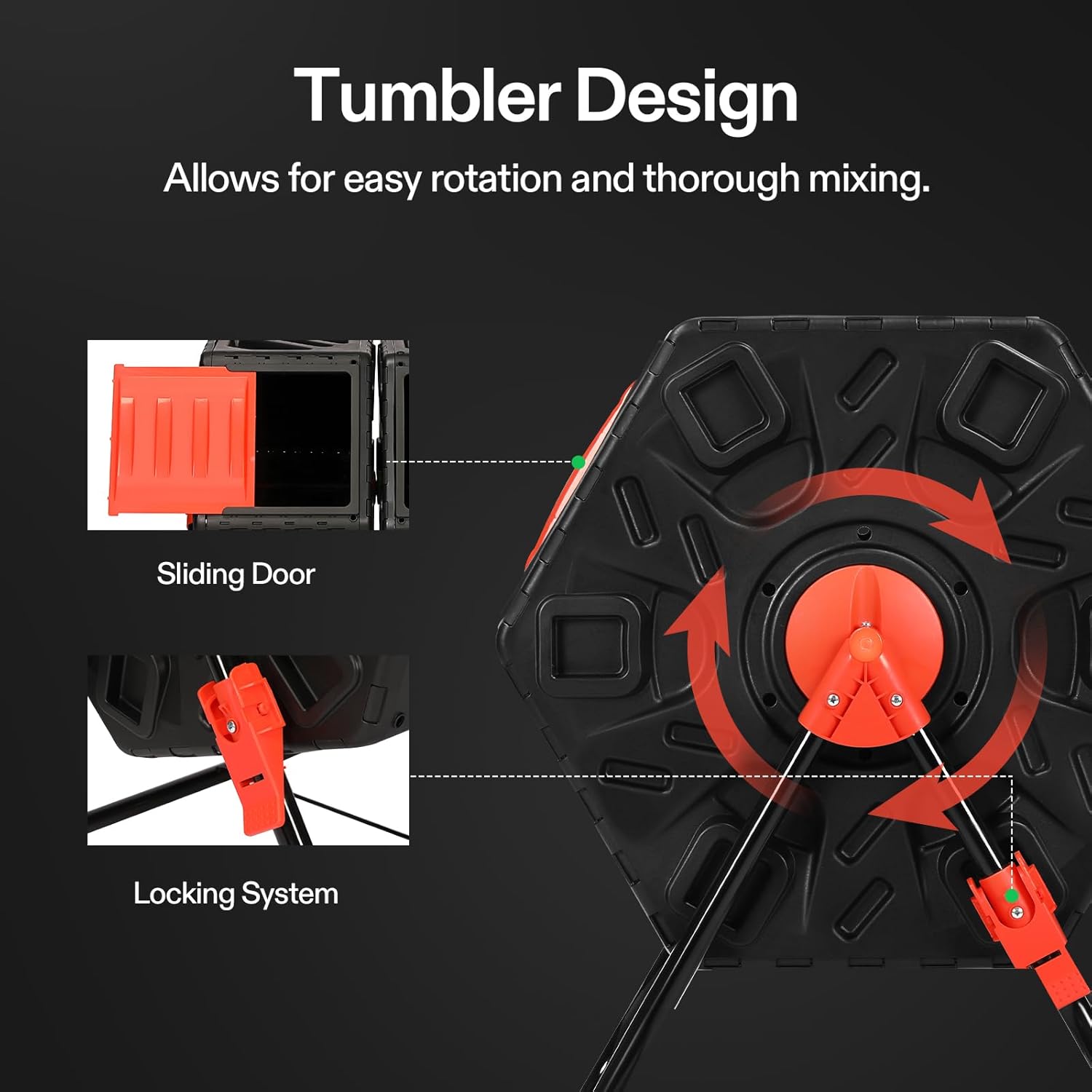 - Tumbling Design: The rotatable design speeds up the composting process by ensuring fully aerated compost materials; The black compost tumbler absorbs the full heat of the sun and allows for a 6-8-week composting process in warm temperatures; Just fill it up and give it a spin every couple of days, no digging or hand mixing required