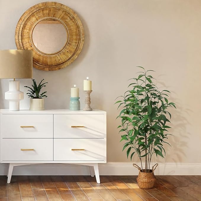 - Cost-effective: This artificial tree is sturdy and durable and comes with a woven basket to provide a better decoration for your room. The cement-filled black planter keeps the plant firmly in place.