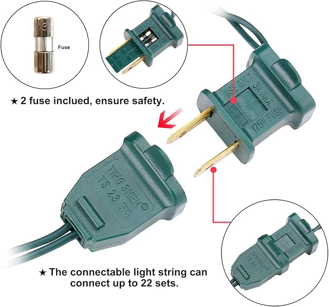 - 【Mini LED Christmas Lights Specification】: This green wire christmas string lights includes 100 count multicolor led lights, total length 35.3ft, lights length 33ft and each led is 4 inches apart, 24 inches lead wire, 4 inches end connector (Extra 2 x replacement bulbs and 2 x fuse included)
