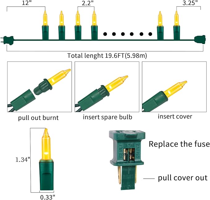 - 【Green Wire Christmas String Lights Decoration】:100L traditional incandescent Christmas light set,19.6Feet Yellow Christmas Mini String Lights,each set include 4 Extra Bulbs & 2 Replacement Fuses.Perfect for indoor and outdoor decoration.Plug in,put it where you want,watch and enjoy this light.The light can be reused for many years.