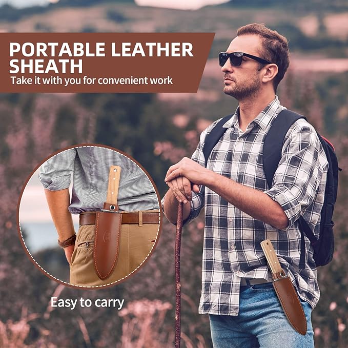 - Leather Sheath: The sheath of weed puller made of Leather, more durable and built for long-term use. Metal snap is for securing this hori hori gardening knife, unfastening and pulling out to use anytime.
