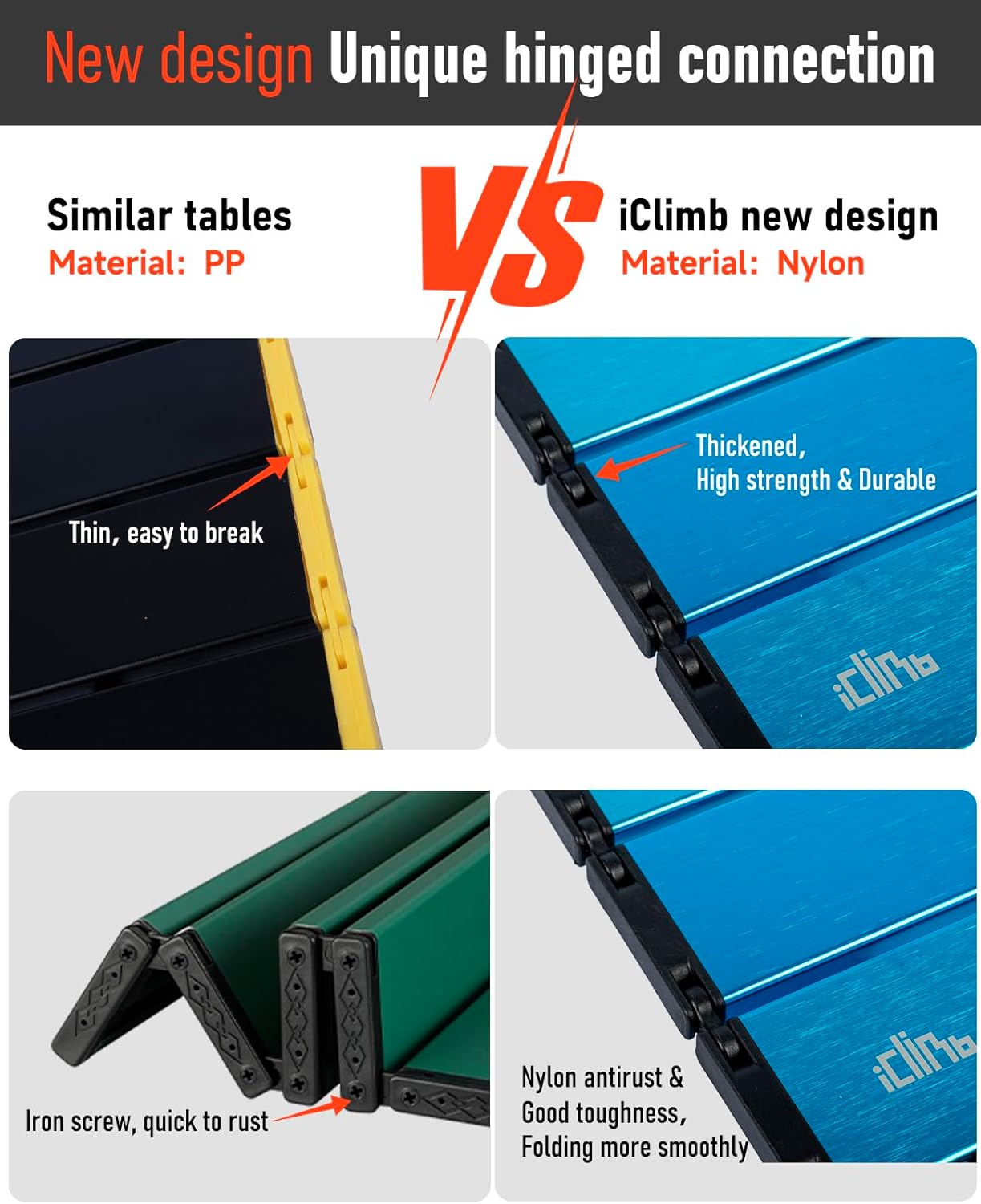 - Ultralight, made of aerospace-grade aluminum alloy, only 3 lbs; Max Load 66 lbs; Unlike wooden or nylon-top tables, this table is durable, waterproof, corrosion-resistant, easy to clean; Sturdy joints and anti-slip feet keep the table stable, with legs that won’t fold, bend, or slip on any terrain; Very easy to set up, just open the base frame and attach the tabletop, enjoy your leisure time in seconds, video guide available on this page.