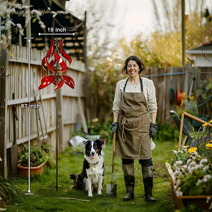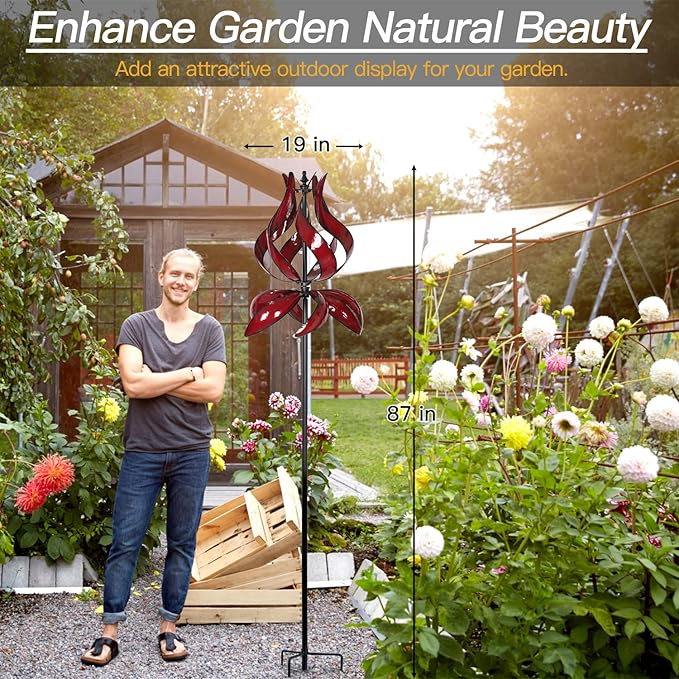- BEAUTIFUL TULIP DESIGN: This stunning metal yard spinners features a lovely red finish and tulip design. Dual rotors spin independently and rotate 360 degrees. The kinetic yard wind spinners has thickened poles (diameter 22mm, 40% thicker than others) and stable metal stake with three prongs to ensure its firmly planted for windy days and against a snowy landscape.