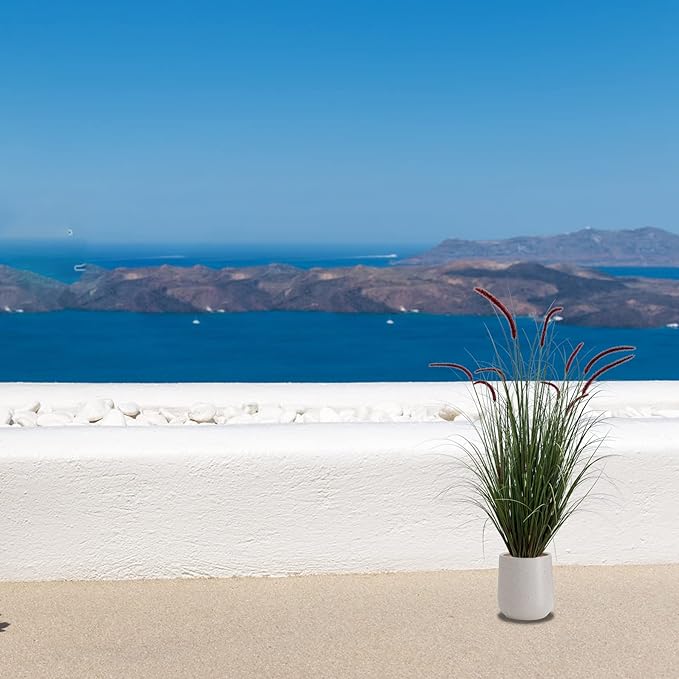 - 1.This faux plant features close to natural green grass with 10 Purple silk flowers, all inside a durable and solid flowerpot. Artificial Setaria grass is 47 inches high.base with a black plastic pot in 5'' dia ,5.9''high.it’s easy to put it in a nice bigger planter as desired.