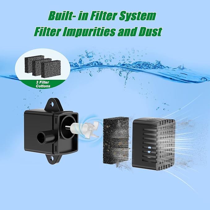 - Blocking Protection System: Solar powered fountain comes with an anti-clogging technology, it will stop working automatically when the filter cotton or rotating shaft is blocked in the direct sunlight; Tips: If the solar fountain stop working, please clean the filter cotton and rotating shaft; Please do not put the solar fountain in a place where there is no water and the sun shines directly to avoid dry working