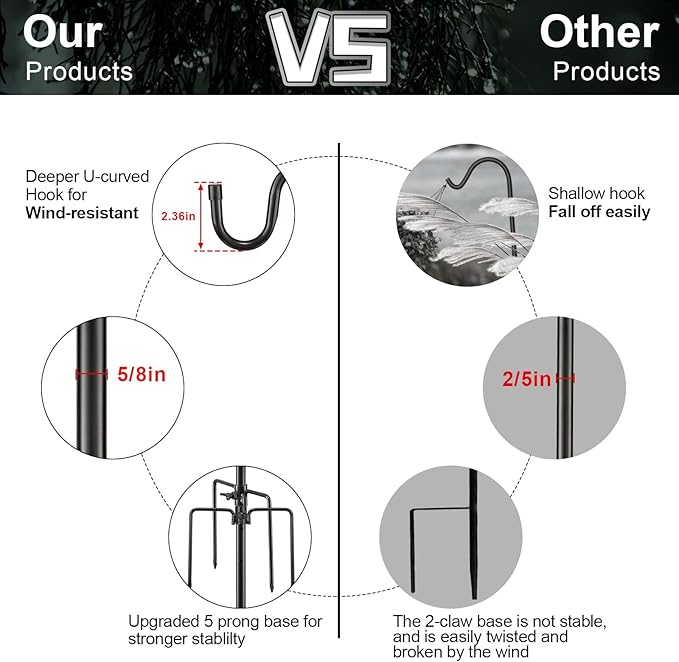 - ★【UNIQUE DESIGN】The 5 base fork design of the shepherd hook provides excellent stability, allowing it to bear heavier weight without falling or bending. The shepherd hook with base is more stable and stronger when inserted into the soil. The outdoor shepherd hook uses a 5/8 diameter rod and a larger hook design, which can better hang items and prevent them from falling.