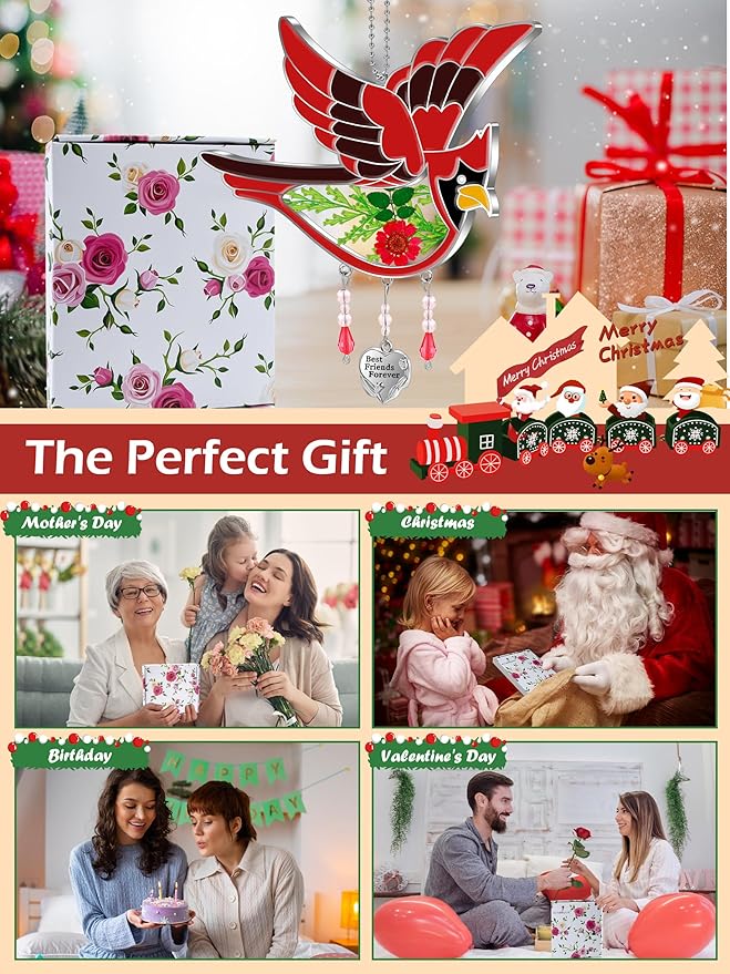 - [Attractive and unique Cardinal Bird design] - This new Cardinal style features a stained-glass style with decorative metal edges and real flowers pressed between the glass. Adorned with Best Friend Forever Heart, and outstanding engrave craftsmanship. Rose gift boxes packing, comes with a suction cup and you can hook it quickly and easy to hang.