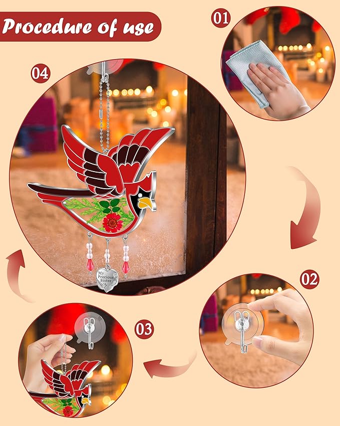 - [Attractive and unique Cardinal Bird design] - This new Cardinal style features a stained-glass style with decorative metal edges and real flowers pressed between the glass. Adorned with My Precious Sister Heart, and outstanding engrave craftsmanship. Rose gift boxes packing, comes with a suction cup and you can hook it quickly and easy to hang.