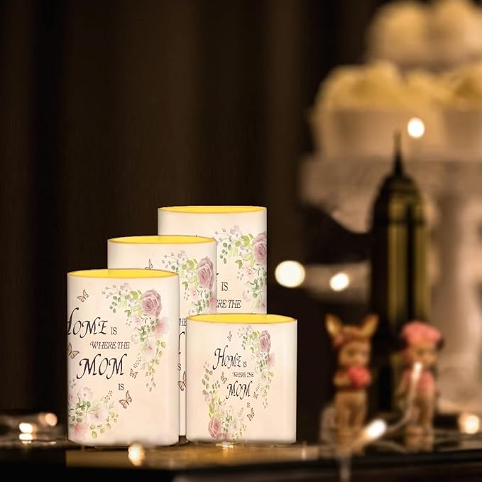 Mother's Day Decor Flameless Light Candles 4 PC, Home Is Where The Mom Is, Battery Operated Candles with Colorful Light Timer Remote Control Fake Tealights Home Ornaments, Pink Rose Butterfly