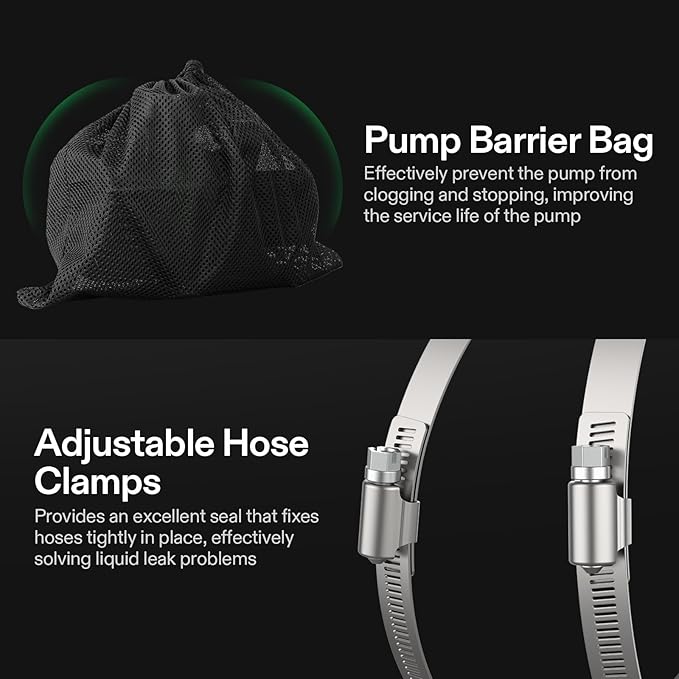 - Detachable Filter & Barrier Bag: Lift height can be up to 20Ft/6.1M; Detachable filter and pump barrier bag effectively prevent the pump from clogging and stopping, improving the service life of the pump