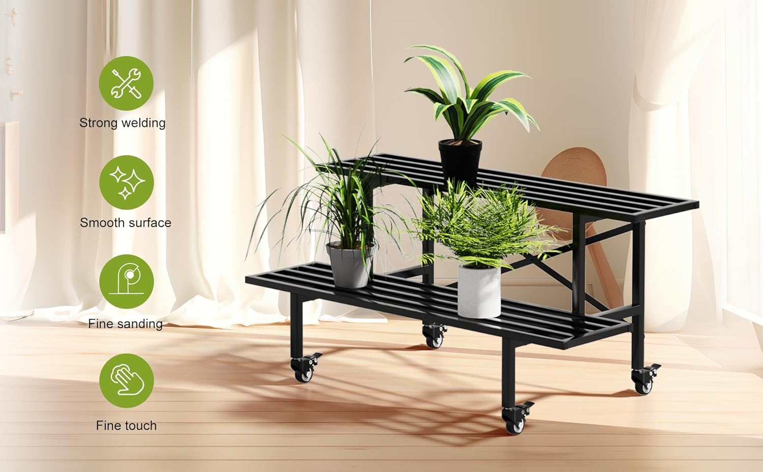 Zhongma 2 Tier Sturdy Metal Plant Stand with Wheels, L35.43 x W17.5 x H16.14 inch, Heavy Duty Plant Holder for Home Indoor and Outdoor,440 LBS Capacity & Heavy Duty Construction