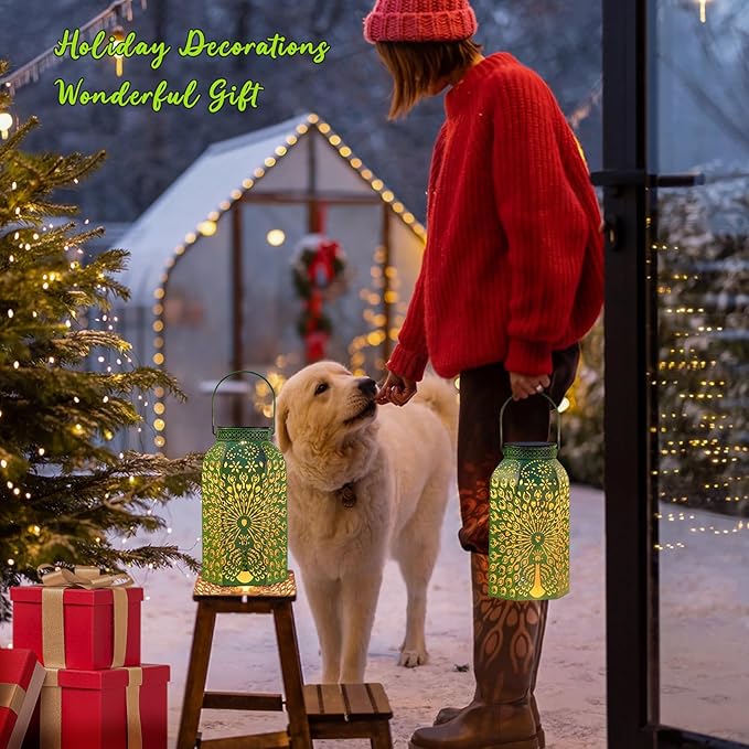 - {Unique Peacocking Design} The 2Pack big outdoor lanterns come with peacock hollow design with attractive and lovely natural green color, 800mAh Battery, emit 13 high lumens bright warm white glow and cast amazing pattern.Green peacock symbolize good luck, hopeand health, which is really nice gifts for your mom dad grandma grandpa sisters wife and friends.