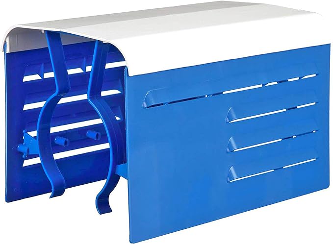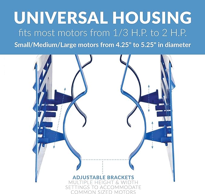 - Rugged UV-resistant plastic motor cover protects pump motor from rain, dust and sunlight; Adjustable to fit most motors (Blue Devil cover).