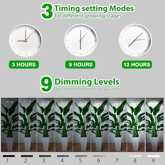 - Automatic Daily Timer: This plant light has a timer with three preset cycles (3/9/12H). Set the time and the light will automatically turn on and off each day