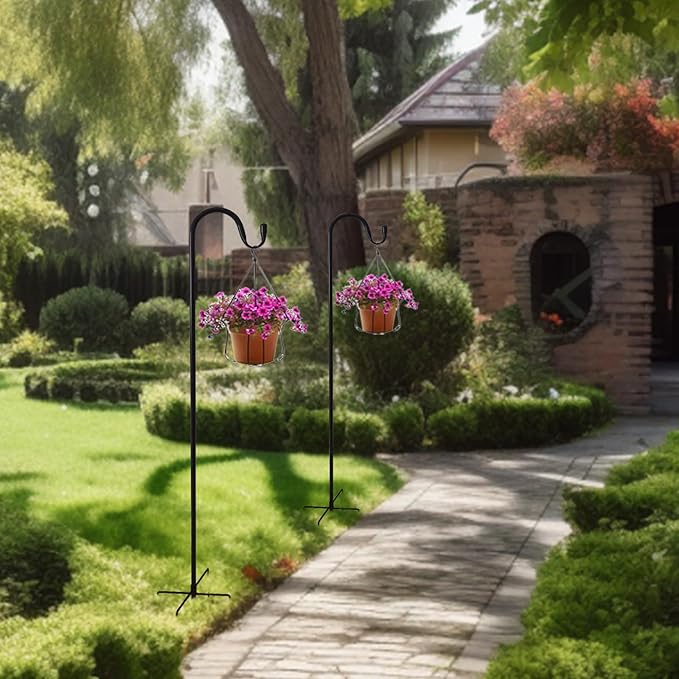 - Elevate Your Outdoor Living Space: Our Shepherd hook stands outdoor are versatile and perfect for hanging an array of items, like bird feeders, solar lights, lanterns, flower baskets, garden lights, wind chimes and so on. The elegant appearance makes them an excellent choice for outdoor activities