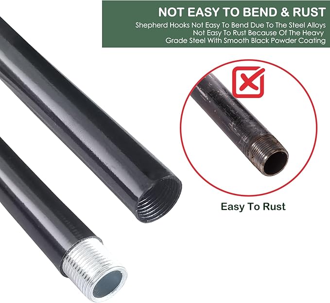 - Built To Last: Constructed with premium heavy-duty metal, our shepherd's hook is designed to stand the test of time. Its black powder coating not only adds a touch of elegance but also protects against rust, ensuring lasting durability