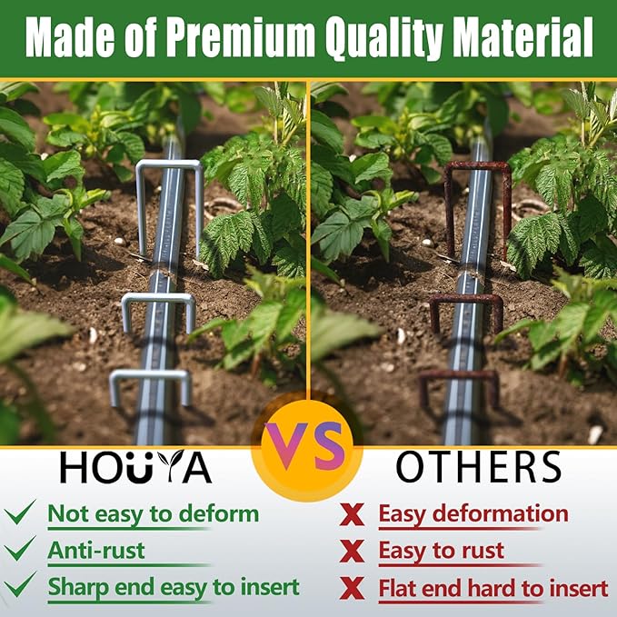 - 【Multi Purpose】A good tool used in garden or yard. The landscape pins can fix irrigation tubing, weed barrier, landscape edging, vegetable bulb and other various items.