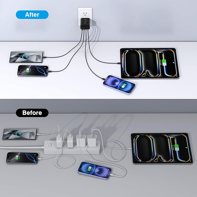 - Multiport Charging: The charger block has Dual USB-C ports and Dual USB-A ports. Allow users to charge phone, tablet and headphones simultaneously to minimize waiting time. It’s also a great space saver instead of taking up 4 wall outlet ports. The best replacement for your original usb charger