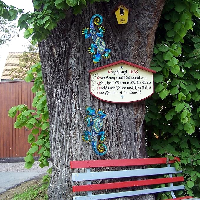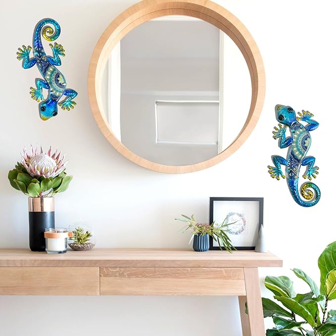 - 🦎【Design】 metal lizards outdoor decor measures 12*5.5*0.6 inch,suitable size for any space. Exquisite lizard wall-hanging suit uses Dreamy blue gradient as the main color, with the same color Bohemian pattern, vivid curly tail and 3d eyes, which will bring special decoration to your garden