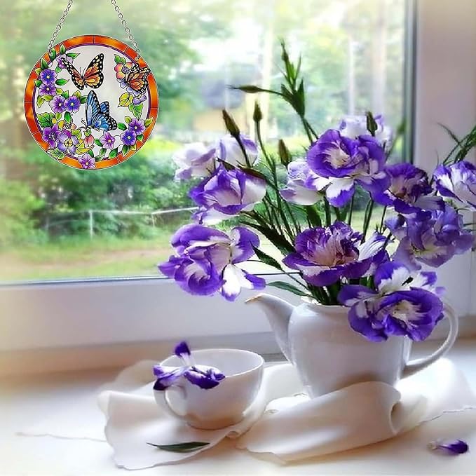 - 【Pretty Window Decoration】This is a very pretty suncatcher. It's not huge (about the size of your hand) which is the perfect size for the windows. It adds a nice accent to a window without dominating it .so you can look outside to spot real butterfly and flowers.The colors are bright and catch the sun beautifully. It comes in a color box gift packaging.