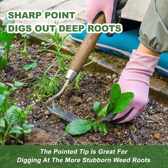 - 【Sturdy and Durable】The scraper hoe is made of thicker stainless steel, which is more durable, meaning it doesn’t bend like a cheaper hoe when you use it to dig, The Comfortable solid wood handle is ergonomically streamlined to fit the natural shape of the hand when holding and using it, helping to relieve strain on the arms and hands, even for prolonged use without tiring your hands.