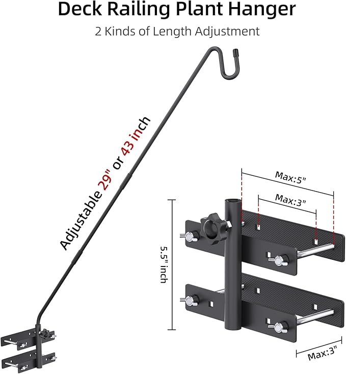 - ➤【Adjustable Deck Plant Hanger】The shepherds hook for deck railing leaves room for adjustment and can be adjusted within a 180 degree range.So convenient to replenish food for your bird feeder. Or change pole length from 29” to 43”.