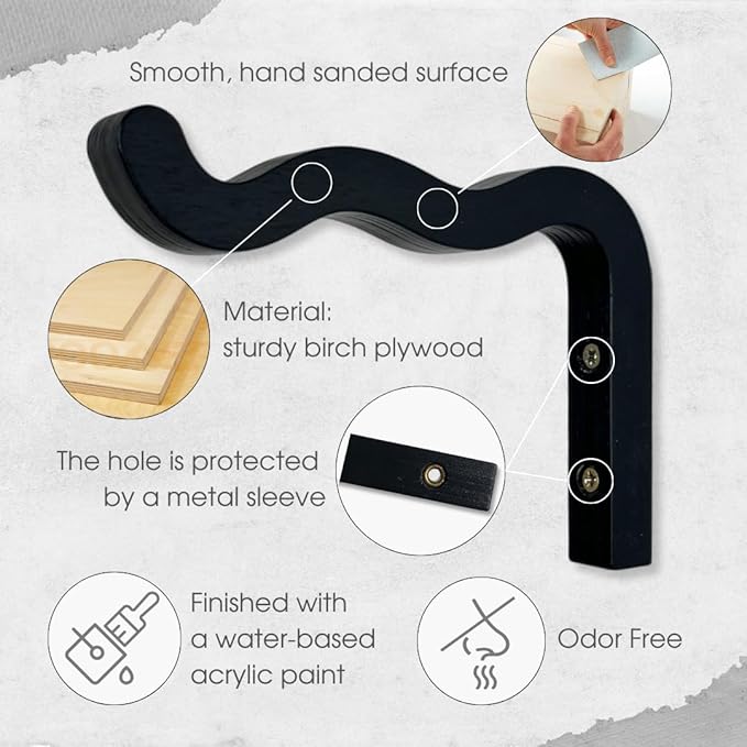 2-Piece Set of Wavy Wooden Wall Planters for Indoor Plants 6 Inch - Natural Plant Hook for Wall Plant, Wind Chimes, Flower Brackets, Patio Garden Decorations - Bracket Plant Hanger (Black)